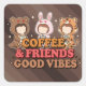 A cute and colorful illustration of three friends wearing animal (bear, bunny, and tiger) enjoying their favorite coffee.