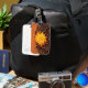 Name tag with a photograph in warm tones with coffee beans and a yellow daisy tinted with orange on a wooden background.