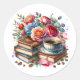 A really pretty ai watercolor illustration of a a stack of vintage books, a cup of tea or coffee and pretty flowers large stickers or envelope seals.