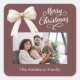 A muted coffee brown background, cream coloured text and a bow. Merry Christmas is written with an elegant hand-lettered style font. Personalise and add your family name.