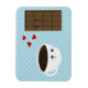 A cute kawaii cup of coffee and bar of chocolate, look sweetly at one another, with three red hearts floating between them. The background is light blue with polka dots.