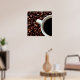 Photograph of a white coffee cup with black coffee, against coffee beans background.