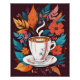 A colourful poster featuring a coffee cup surrounded by coloured leaves.