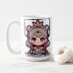 Chibi villain girl with cape and crown holding coffee, evil cute smile