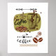 A creative vintage-style graphic featuring hand-drawn coffee beans and a sketch-style mug on an olive-green background, accompanied by the classic "But First, Coffee" slogan.
