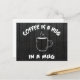 Combination of Simple Old Style and Modern Script Coffee Saying postcard. This Designs features of dark deep wooden background with Coffee is a hug in a mug saying written in modern script. Added vintage style coffee mug. All printed in white colour. This sign will look great printed on any type of media. Perfect gift for any coffee lover. Decor for coffee bar, coffee shop or restaurants.