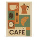 The poster is divided into a modular grid composed of squares and rectangles of varying proportions, each containing a stylized representation: a cup, a coffee grain, an Italian coffee machine, a spoon, a clock, a croissant. Each element is drawn in a simple, unicolored silhouette in a pictogram style. The layout plays on the rhythm and balance of shapes, like a graphic game. The colors are soft but assertive: terracotta, cream, brown, soft orange, sage green. The word CAFÉ is centered at the bottom, in a dedicated box.