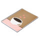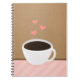 A coffee mug, full of coffee, is on a lightly textured brown background, with the bottom half in pink stripes. Three pink hearts float above the coffee.