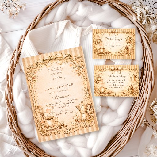 Celebrate a sweet new arrival with this vintage-inspired coffee baby shower design, featuring hand-drawn espresso details, warm sepia tones, and an elegant storybook frame. The cozy café aesthetic is perfect for a relaxed, intimate gathering with a timeless European feel. Ideal for coffee lovers, neutral baby showers, and classic celebrations with a warm, nostalgic charm.