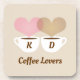 A cute personalised drink coaster design for "Coffee Lovers". Includes two coffee mugs with intertwined light pink and latte brown heart shaped steam and a cream coloured background . Personalise the custom text with the couple's first name initials.