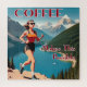 You run over high mountains and do ultra running races because of coffee and coffee alone. This great design shows a runner in the mountains in the style of a retro vintage travel poster.