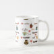 A white coffee mug with the word "coffee" in different languages and fonts and images of coffee mugs and hearts. This would make a perfect gift for any coffee lover.