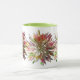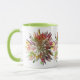 I have no idea how they so perfectly splatter painted this fabulous, white spider mum, but when I saw them in the store's fresh flower display, I knew I had to bring the bunch home. The paints; green, yellow, orange, pink and purple, splattered with varying degrees of intensity, only adding to the visual interest of this gorgeous flower. This closely-cropped image; offered here on this fabulous, ringer style, coffee mug; is actually on a "blank" background . . . so you can select the colour you desire. White (which is the default and pictured here) and black are good choices, but you may also choose from the coordinated colours: pink (LEX # fa9dc9); green (LEX # a4d28a); yellow (LEX # f4ea93); orange (LEX # faa591); and purple (LEX # ab8ac3). Naturally, you are not limited to these colours. The numbers are provided for your convenience. You may select any colour you wish for the background, making it even more truly personalised to your tastes.  Additionally it is pictured with lime accents on the mug, but other accent colours and mug styles are available and you are welcome to choose the combination you prefer.