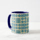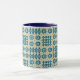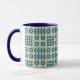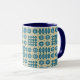 A chic white Coffee Mug, with a Bright Blue lip and handle and a pattern of traditional Welsh Tapestry motifs in Navy Blue on a Sable background. This pattern will fit all Mug sizes.