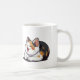 This coffee mug depicts a calico cat yawning and waiting for today's snack.
