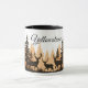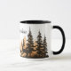 This ceramic coffee mug is shown with a art print of deer in the forest with Yellowstone text.