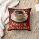 A steaming cup of black coffee rests on a white saucer against a red background, with the words "Merry Christmas" elegantly printed beneath