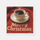 A steaming cup of black coffee rests on a white saucer against a red background, with the words "Merry Christmas" elegantly printed beneath
