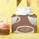 Coffee cups in a repeating pattern on a coffee coloured background.