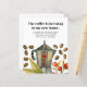 This cute budget moving announcement card for coffee lovers features watercolor art of a coffee pot with coffee beans and botanical accents. The original quote by Susan Coffey reads "The coffee is brewing in my new home." Personalise with your name, new address and phone number. The back of the card has a custom message and signature accented by a sprig of coffee berries. Designed by Susan Coffey.