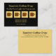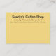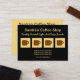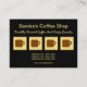 Customisable Coffee Shop Business Cards. Add your own details in minutes. Images of coffee cups. Background is black . You can change colour of background as you wish as well as the style of font. Back of this Coffee Shop Business Card can be used as a Loyalty Rewards Card, which your staff can put place a stamp on. If this is not required, this can be simply deleted from the card.