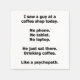 For the sarcasm lover in all of us. Check out this witty “I saw a guy at a coffee shop today. No phone. No tablet. No laptop. He just sat there. Drinking coffee. Like a psychopath.” design on apparel and gifts.