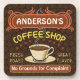 These coffee-themed coasters are perfect for anyone who runs their own coffee shop or has a coffee theme in their home kitchen decor. Done in retro brown, orange, beige and yellow, this espresso / cappuccino inspired design features a cup on a saucer, two personalised text banners and the words "Coffee Shop / Fresh Roast / Great Flavour" in yellow.