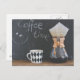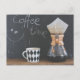 A chalkboard in the back says "coffee time" with a smiley face, written in chalk. In the front on a rustic wooden table is a coffee mug with a diamond pattern design in black and white. Sitting beside the coffee cup is a coffee pot with a large filter and a freshly brewed pot of coffee. Looks rustic and old fashioned.