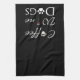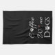 The perfect kitchen towel for those who love coffee, wine, and dogs. Kitchen towel design features a fancy text for coffee with a coffee cup adornment for the letter "o", wine which contains a glass of red wine for the letter "i", and dogs with a paw print embellishment in replacement of the "o". Additional gift items available with this design as well.