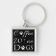 Keep your keys with a funny Coffee Wine Dogs Metal Keychain. Keychain design features a fancy text for coffee with a coffee cup adornment for the letter "o", wine which contains a glass of red wine for the letter "i", and dogs with a paw print embellishment in replacement of the "o". Additional gift items available with this design as well.