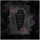 Dark and beautiful, this coffin wedding invitation is perfect for a gothic or Halloween wedding. Coffin has grey glitter sparkle around the edges and purple roses with gold and grey green leaves. This lines at the edges are a nice touch. The colors are black, purple, green, silver and gray. Background is a moody black watercolor.
