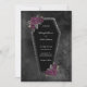 Dark and beautiful, this coffin wedding invitation is perfect for a gothic or Halloween wedding. Coffin has grey glitter sparkle around the edges and purple roses with gold and grey green leaves. This lines at the edges are a nice touch. The colours are black, purple, green, silver and grey. Background is a moody black watercolor.