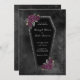 Dark and beautiful, this coffin wedding invitation is perfect for a gothic or Halloween wedding. Coffin has grey glitter sparkle around the edges and purple roses with gold and grey green leaves. This lines at the edges are a nice touch. The colours are black, purple, green, silver and grey. Background is a moody black watercolor.