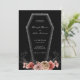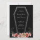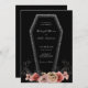 Dark and beautiful, this coffin wedding invitation is perfect for a gothic or Halloween wedding. Coffin has grey glitter sparkle around the edges and a floral arrangement of a variety of roses, feathers and thorns. See coordinating items in our shop, Enchanted Finch.