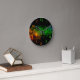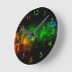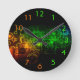 Cool, trendy and modern mechanics theme. Black background colour. Cogwheels making an abstract pattern. Bright neon colours, blue, green, yellow and Orange. With orange and green clock face numbers.