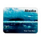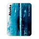 A stylized, blue monotone image of cold polar sea.. Ice hugs the coastal mountains. Customizable text reading, " Alaska" also appears. Add your own additional text.