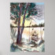 traditional watercolor painting of a lake scenery with two big trees in front and upcoming clouds as a decorative poster print.