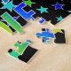 This lively and exciting birthday-themed jigsaw puzzle design features the message "HAPPY BIRTHDAY, COLE" with the characters having a colourful rainbow spectrum inspired gradient pattern, in addition to a vibrant star shapes background pattern. A vibrant puzzle like this might be a fun way to send a birthday greeting message to somebody named Cole. [~Z0000468]