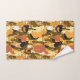 Towel set in a collection of cute cats, in different shades of orange, black, and white, arranged against a warm brown background. Small hearts and floral accents are interspersed throughout, adding a whimsical touch.