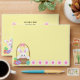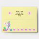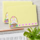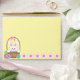 This envelope design features an adorable white rabbit with colourful Easter eggs. On the front the rabbit is peaking out of a basket surrounded by eggs and a flower border. On the back the rabbit is carrying the eggs. The flap of the envelope has an area for your return address. The inside liner has a repeat pattern of the white rabbit. This envelope coordinates well four card designs featuring the white and brown rabbit.
