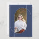 This 5" x 7" flat graduation announcement features and arch design with two photos, one on the front, one on the back in school colours, navy blue and burnt orange. Placeholders include, graduate name, college or university name, the school type, the degree and an added line for additional information such as special honours or degree focus.