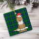 Cute graphic illustration of sitting, brown/white collie wearing a red, Santa hat on top of head and it's pink tongue is out. Tan banner underneath with customisable pet's name. Blue/green tartan plaid background.