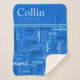 Typographic short name text blue, dark blue, muted blue, and sky blue, on a royal bright blue background custom name meaning blanket design. Background colour can be changed if required. Fun personalised graphic text personalised blanket. Personalise with your own short name, currently reads Collin A young dog. Loyal, victor of the people. © Art and design and name meaning by Sarah Trett for www.mylittleeden.com