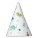 The HECTOR colourful dinosaur birthday party hat design has a white background with colourful watercolor dinosaurs and jurassic plants in a pattern around the dino party birthday party party hats.