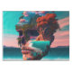 A skull head has been completely colored in an abstract style to bring you into the world of creativity and surreal design, in the style of photo-realistic landscapes, tropical landscapes, futuristic realism, pixelated realism, light crimson and sky-blue, surrealistic dreamscapes