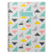 Colorful abstract retro shapes 90's pattern, notebook. Notebook features abstract gray doodles with colorful triangles in gray, pink, yellow and teal pattern with a single template text line for name or other text on matching teal label.