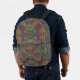 Colorful backpack with front view showing vibrant geometric patterns in reds, blues, and greens. Back view reveals black straps and padded design.