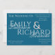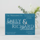 This Design Features a Deep Teal Background and a softer, blue Text. The text combination is a mix of bold and calligraphy. Perhaps the best part about this Invitation is that is comes in multiple colors, so you can mix and match different invitation colors with your other wedding stationary, but everything is designed to be cohesive, no matter what color you pick. We wanted something fun and going "full color wheel" seemed to be the ticket. We home you enjoy this invitation and the coordinating items available in our store.