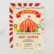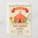 Amaze your guests with this cool carnival theme baby shower invite featuring a cute lion, a beautiful circus tent and a colorful Ferris wheel with vibrant typography against a parchment background. Simply add your event details on this easy-to-use template to make it a one-of-a-kind invitation. Flip the card over to reveal a red and beige starburst pattern on the back of the card.