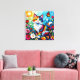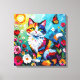A sweet canvas wall art with a cute illustration of a colorful abstract cat surrounded by flowers, butterflies and the sun in a paper quilling impasto style.